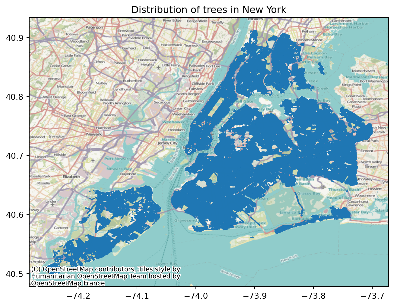 ax.set_title("Distribution of trees in New York")